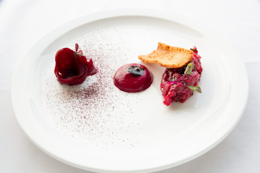 Nous passions ensuite à table pour déguster l’entrée, composée de tartare d’agneau, de pétales de betteraves confites, d’émulsion de yogourt de brebis, de gelée de vinaigre de bleuets, de pousse de betteraves, accompagnés d’une tuile de pain croustillante. Le vin était un Cozy rosé du Domaine Deslandes. Ce plat était, sans conteste, celui que j’ai le plus apprécié.