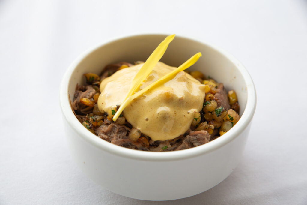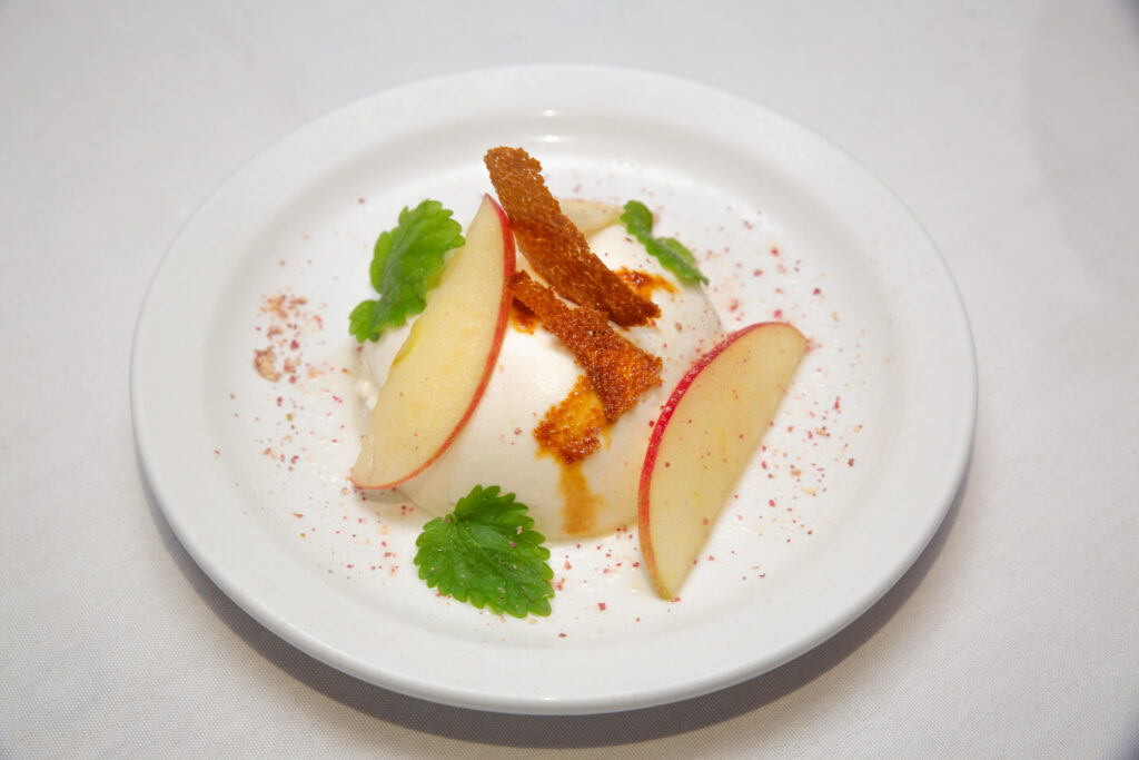 Le second plat était constitué d’une épaule d’agneau confite, accompagné de maïs et de pommes de terre croustillantes, dans une sauce foyot. Pour l’accord mets/vin, on avait choisi le Vidal et le Frontenac blanc. Le trou normand, composé d’un granité de pomme et cidre du verger, y faisait suite.