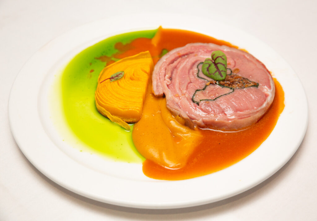 Le plat principal était composé d’une selle d’agneau aux épinards et tournesol, accompagné de courge butternut confite au gras d’agneau, d’une purée de courge et d’argousier et pousses de mélisse. Le vin choisi était le Pinot noir Côte de Champlain.